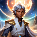 a man in a white and gold outfit standing in front of a full moon