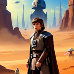 a man in a star wars outfit standing in front of a desert